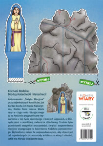 Kolorowanka zawiera opis jak modlić się na różańcu oraz na ostatniej stronie do wycięcia jest Najświętsza Maryja Panna z Lourdes stojąca przed grotą Massabielską (Massabielle).
